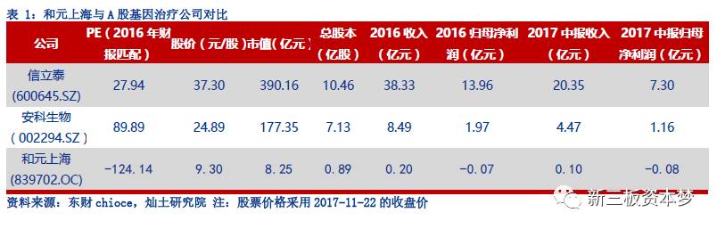 A股相关基因治疗的上市公司有信立泰和安科生物,信立泰主要布局心内科,并搭建了生物药研发平台,包括重组蛋白药物、抗体药物和基因治疗药物研发平台,突破抗肿瘤领域,涉足ADC和I-O。其2016年的收入达38.33亿,归母净利润达13.96亿元,2016年财报数据下的市盈率为27.94;安科生物以重组人生长激素、重组人干扰素和活血止痛膏为主营业务,形成以生物药为主,化药、中成药为两翼的发展模式,并拓展精准医疗诊断+治疗领域,现已布局 CAR-T、PD-1、溶瘤病毒三大肿瘤前沿疗法,公司2016年收入达8.49亿,归母净利润达1.97亿,2016年财报数据下的市盈率为89.89。和元上海以基因治疗的病毒载体业务为核心,并向下游应用领域的基因治疗药物研发拓展,现阶段公司处于发展期,尚未盈利,PE指标为负,不具参考性,而A股基因治疗药物研发、CAR-T开发相关概念的上市公司信立泰、安科生物估值及盈利水平均较高,随着和元上海的发展,在基因治疗药物研发方面布局的深入,未来的高估值水平值得期待。