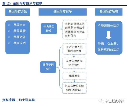 基因治疗按体内基因治疗和体外基因治疗来分,其程序是不同的。体内基因治疗是将携带外源基因的重组病毒或非病毒载体直接注射到体内;而体外基因治疗过程主要为,一是生产带有目的基因的病毒,二是从病人体内分离靶细胞,三是体外感染,四是把病毒转染的靶细胞回输病人体内。而随着基因治疗的策略与技术不断丰富,基因治疗也由最初的单基因遗传病的治疗,发展到对肿瘤、神经、心血管、眼科等疾病的治疗。