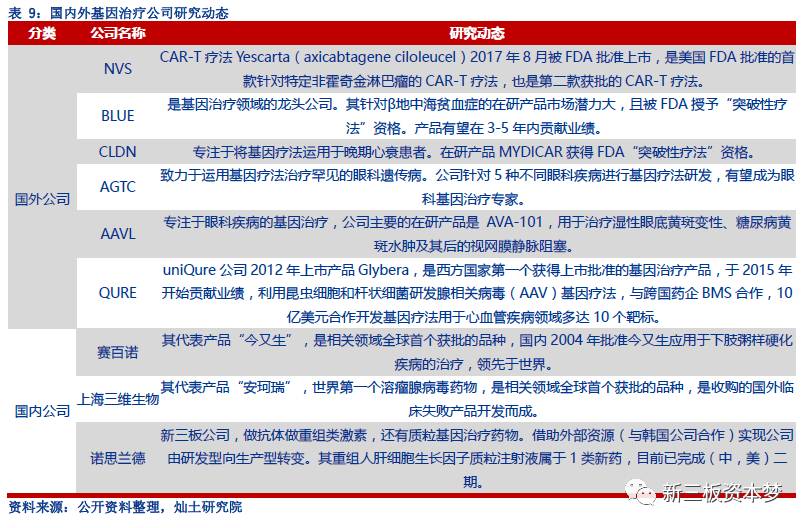 国外方面,基因治疗相关上市公司有NVS、BLUE、CLDN、AGTC、AAVL和QURE等。