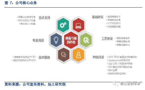 公司作为国内领先的生物医药技术和科研服务供应商,从事基础研究服务、基因治疗药物研发和临床级重组病毒产业化制备三大块业务。基础研究服务包括基础科研服务,以及专注于向国内的科研院校、医疗机构、医药企业等提供基因治疗研究 CRO 服务的整体解决方案;基因治疗药物研发是指公司基于几年的积累和研发,已构筑成熟的基因治疗技术研发平台,并于2015 年末正式进入该研发领域,为基因治疗药物 CMO 业务打下扎实的基础;临床级重组病毒产业化制备是公司的主要业务,公司一直以基因治疗载体研发、生产与应用转化为核心,提供病毒载体工具设计和制备服务、疾病模型设计、构建和药物筛选服务。