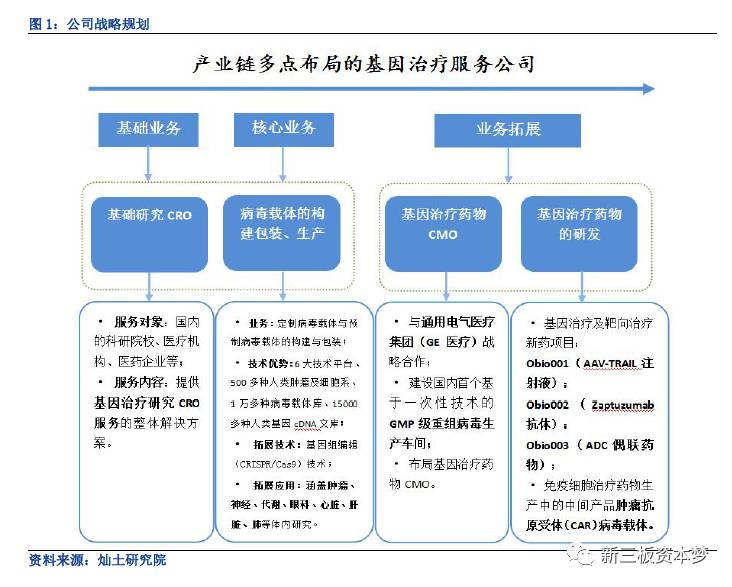 在核心业务和基础业务的基础上,公司积极向基因治疗药物CMO、基因治疗和靶向药物研发领域拓展,一方面打造基因治疗药物CRO/CMO平台以提高业绩,另一方面加强基因治疗和靶向药物研发以提升整体估值。公司与全球最大的生物制药技术和设备供应商通用电气医疗集团(GE 医疗)开展基因治疗全方位战略合作,建设国内首个基于一次性技术的GMP级重组病毒生产车间,布局基因治疗药物CMO。同时,公司2015年末正式进入基因治疗药物开发领域,目前重点推进 Obio001、Obio002 及 Obio003 三款基因治疗及靶向治疗新药研究项目,同时启动免疫细胞治疗药物生产中的中间产品肿瘤抗原受体(CAR)病毒载体研究,基因治疗药物的研发也为基因治疗药物 CMO 业务打下扎实的基础。