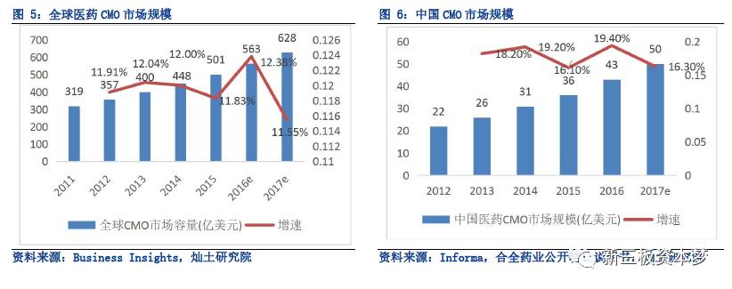 由于创新药研发难度加大,加上产业链分工的细化,促进了CMO市场的发展。据Business Insights数据,2017年全球CMO市场规模将达到628亿美元,增速为11.95%,未来将保持稳定的增长。在国际CMO市场良好发展背景中,加上国内多项医药政策(新版GMP认证、仿制药一致性评价、药物临床试验自查核查、药审加速、MAH 制度)的出台,国内CRO、CMO市场发展形势大好。Informa数据显示,2012年中国CMO市场规模为22亿美元,增速为16%,而2017年市场将达到50亿美元的规模,2012年到2017年的年复合增长率达17.84%。受到政策影响,目前大部分国内CMO企业培养的是国际上的大客户,未来随着国内CMO市场的开放,整个国内CMO行业的增速将进一步提升。且围绕药物研发布局,打造CRO-CMO一体化,从而实现新药研发一体化服务将成为趋势。