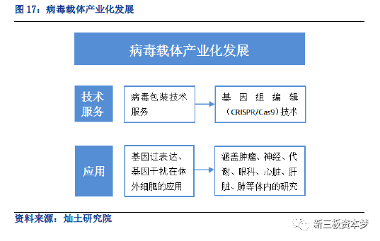 公司以基础研究服务为基础,向国内的科研院校、医疗机构、医药企业等提供基础科研服务和基因治疗研究CRO服务的整体解决方案;以病毒载体的产业化制备为核心,提供定制或预制病毒载体构建与包装业务,公司利用已掌握的数十项病毒载体设计、生产和质控核心工艺技术,已拥有10000多个人类表达基因,500多种肿瘤及正常细胞系的基因和细胞资源库,全力发展病毒载体的产业化,从最初的病毒包装技术服务拓展到基因组编辑(CRISPR/Cas9)技术,从简单的基因过表达、基因干扰在体外细胞的应用,拓展到涵盖肿瘤、神经、代谢、眼科、心脏、肝脏、肺等体内的研究,从而率先引领病毒载体设计构建和制备服务市场;同时,拓展基因治疗药物的研发。
