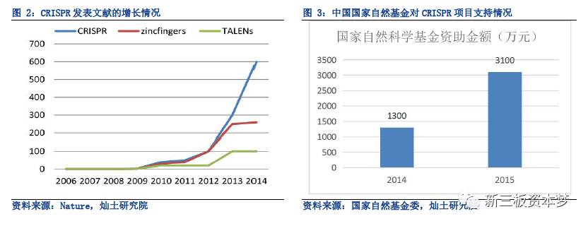 此外,未来CRISPR应用领域广阔,公司加强对基因组编辑(CRISPR/Cas9)技术的研发,成长空间巨大。基因编辑技术自第一代锌指核酸酶ZFNs,到第二代转录激活子样效应因子核酸酶TALEN,现在已经发展到第三代CRISPR-Cas9(成簇规律间隔短回文重复序列系统技术(Clustered regularly interspaced short palindromic repeats /CRISPR associated proteins)),近年来CRISPR/Cas9相关的研究急剧增长,CRISPR相关研究文献不断增加,中国国家自然科学基金对CRISPR项目也大力支持,2014年资助31个项目共计1300万资助额,2015年资助金额达3100万,超过2014年的2倍。公司以病毒载体业务为核心,并拓展的基因组编辑(CRISPR/Cas9)技术,将为公司带来巨大的成长空间。