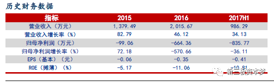 公司营业收入稳步增长,研发投入大尚未盈利。2017年上半年公司实现营业收入986.29万元,同比增长34.13%,2016年公司实现营业收入2015.7万元,同比增长46.12%;2017年上半年公司实现净利润为-858.31 万元,归属母公司所有者利润-835.77 万元,2016年公司实现归母净利润-664.36万元。