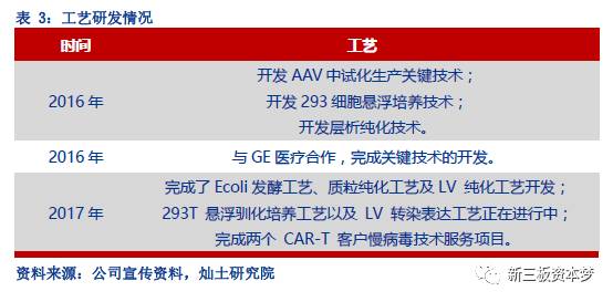 2016年公司有序推动了AAV中试化生产关键技术、293 细胞悬浮培养技术、层析纯化技术等开发,并于2016年下半年与全球最大的生物制药技术和设备供应商通用电气医疗集团(GE 医疗)签订了合作协议,已完成一些关键技术的合作开发。