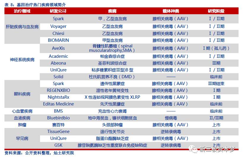 三是根据Clinical Trial基因治疗药物汇总的临床信息得出,目前基因药物以病毒载体为主,约占所有载体的70%,非病毒载体的研究尚处于幼儿期,而病毒载体中腺病毒占比最大,约占23%。在肝脏疾病、血友病、神经系统疾病、眼科疾病、心血管疾病、血液疾病、肿瘤、罕见病等各类运用基因治疗的热门领域里,处于临床前、临床、上市等多个阶段的基因药物大多采用病毒载体,包括腺相关病毒、慢病毒、逆转录病毒,详见以下表格。