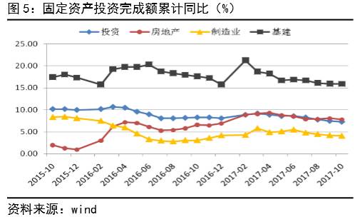 10月,固定资产投资累计同比7.3%,较上月回落0.2个百分点,再创2000年以来新低。三大投资中,房地产投资增速7.8%,较9月回落0.3个百分点;制造业投资增速4.1%,较上月回落0.1个百分点;基建投资增速15.85%,较9月微降0.03个百分点(见图5)。