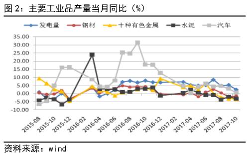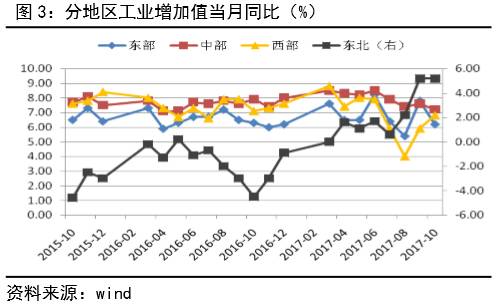 10月主要工业品产量中,发电量同比增速2.5%,较9月回落2.8个百分点;原煤增速1.5%,较9月回落6.1个百分点;此外,由于环保限产在华北、华中等地区影响较大,从东、中部地区工业增加值增速放缓明显可以看出,受环保限产影响,钢材、十种有色金属、水泥持续负增长,影响工业产出整体增速放缓(见图2、图3)。