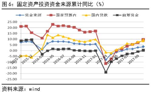 10月,房地产及制造业投资的回落是投资增长下降的主要因素,而制造业投资回落逐步趋缓,但房地产投资受房地产调控、房贷资金趋紧导致需求出现拐点,10月房地产投资降低8%以下,在房地产调控政策不放松基调下,后期仍将面临下行压力,会是四季度投资增长的主要拖累。但随着国家预算内资金和国内贷款增速的持续回升,较9月分别回升0.8和1.0个百分点,在四季度经济面临增长压力的背景下,基建投资将在资金基础推动下开始止跌保持15%以上的增速(见图6)。