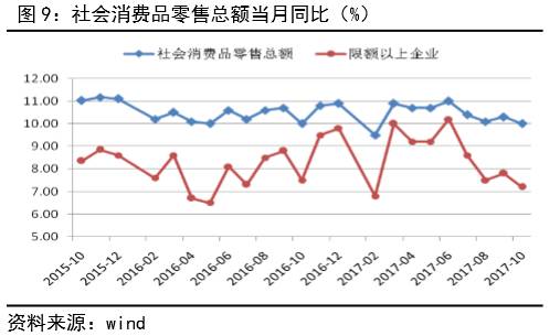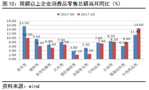 10月,社会消费品零售总额当月同比10.0%,不及预期和上月值。其中,限额以上单位消费品零售额同比7.2%,低于9月0.6个百分点(见图9)。限额以上企业消费品中,家具类、建材类、家用电器类、金银珠宝类及通信器材类的消费增速回落最明显,分别回落5.5、3.4、1.4、2.8和1.7个百分点,是影响消费10月增长回落的主要因素;其中家具类、家用电器类、金银珠宝类和通信器材类的回落是受“双11”线上线下促销活动因素影响导致消费推后(见图10)。综合而言,四季度在需求回落预期但节日集中影响下,11月社会消费品零售总额会有所回升,但对后面消费的挤压12月或将再小幅调整。