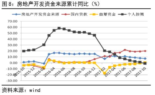 另外,10月份,房地产开发企业到位资金累计同比增长7.4%,低于9月0.6%;但其中,国内贷款增长20.2%,高于上月0.7%;自筹资金累计同比由负转正至0.8%;在其他资金中,个人按揭贷款同比增长-1.0%,为2015年以来首次负增长,这是造成房地产开发企业到位资金增速下滑的主因(见图8)。而限购政策以及购房利率的抬升,加上银行对个人购房资金来源的严查则是造成个人按揭大幅下滑的根源,四季度在调控政策不放松,土地供给增加而购房需求放缓观望的背景下,房地产市场资金面和销售依然面临较大的压力,房地产开发投资增速后期仍将有回落。