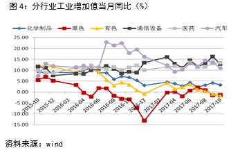 同时,在主要行业中,10月份黑色和有色金属冶炼及压延加工业增速延续9月的负增长,分别为-1.3%和-1.7%,环保限产还影响化工行业10月增速3.3%,较上月回落0.9个百分点,传统行业增速下滑是造成10月规模以上工业增加值同比增速放缓的主要因素;而高新技术产业包括计算机、通信和其他电子设备和汽车等高新技术制造业10月虽有小幅回落但仍保持较高增速,分别为12.8%、和11.0%,另外医药行业增速保持连续上涨趋势至13.5%,对工业整体产出增速形成了支撑(见图4)。四季度在供暖季限产影响下,工业生产供给端的下行压力依在,但在外部经济体复苏增强以及高新技术产业高增速支撑下,工业产出增速呈现放缓但低于6%的概率不大。