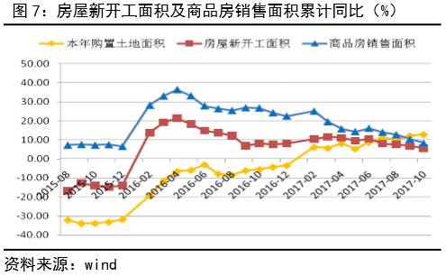 房地产开发方面,10月房屋新开工面积累计同比5.6%,较上月回落1.2%,商品房销售面积回落2.1%至8.2%,而购置土地面积累计同比回升0.7%至六年内高点12.9%(见图7)。在政府调控、信贷紧缩的背景下,房屋新开工和销售面积连续下滑,房地产投资增速在9月小幅反弹后也承压下调,但先行指标房企购置土地面积持续扩张,加强对远期房地产投资的支撑。