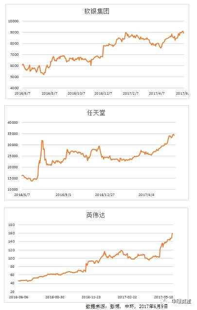 老铁粉丝们也都知道中环资产一直在全球范围内积极布局高科技板块。阿里屡创新高主要是因为中国经济复苏,公司收入成长加快。除了阿里,今年中环布局里的阿尔法机会在科技股板块还有更多:美国的苹果、脸书、亚马逊、英伟达;韩国的三星、海力士;日本的软银、任天堂等等。5月24日彭博报道软银已经拥有全球图形技术巨头英伟达4.9%股份成为其第四大股东,而手游界三大巨人之一的任天堂正是采用英伟达的图睿芯片。拨开重重外在帷幕,发现他们的股价有惊人的相似走势,连连创新高,成为中环布局里的“三朵金花”。