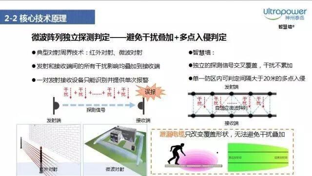 传统的红外对射周界报警技术和微波对射周界报警技术由于发射和接收端之间的所有干扰影响均叠加到接收端,所以一对发射接收设备只能识别并提供单次报警功能,也就是当多点入侵时,系统的判断就会出现问题,从而引发漏报。而与智慧墙外型类似的“泄漏电缆”周界安防技术只改变了覆盖形状,也无法避免干扰叠加所带来的多点入侵的漏报问题。与上述技术不同,“智慧墙”的技术在于实现了微波阵列独立探测判定,避免了干扰叠加,实现了多点入侵的准确判定。