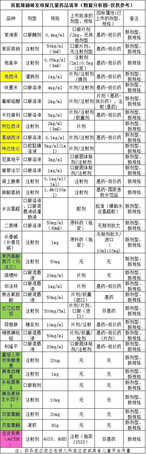 而此次清单公布的药品,上市后属于新药注册类别,,将《清单》药品直接挂网采购,鼓励医疗机构优先使用《清单》药品,各医疗机构要放宽对儿童适宜品种、剂型、规格的配备限制,满足儿科临床需求。
