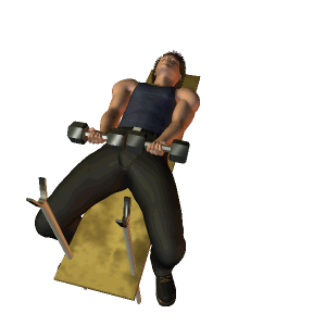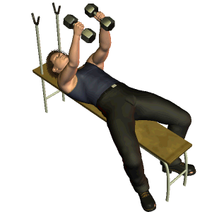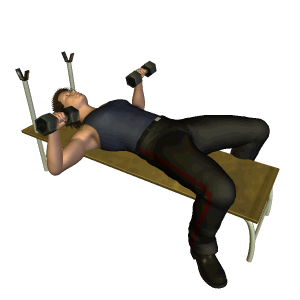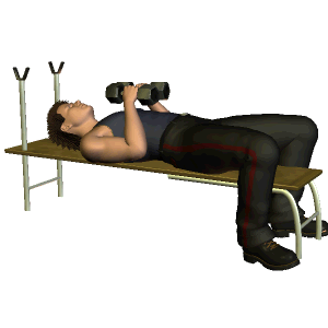 躺在一张长凳上,双脚平稳的踩在地面上,手持哑铃停放在胸上方。提起哑铃呼气!在举的时候让胸大肌有夹紧的感觉。手臂抬起来伸直,慢慢还原动作到原来的位置。在这里重复以上动作。
