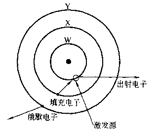 俄歇电子的产生和俄歇电子跃迁过程:一定能量的电子束轰击固体样品表面,将样品内原子的内层电子击出,使原子处于高能的激发态。外层电子跃迁到内层的电子空位,同时以两种方式释放能量:发射特征X射线;或引起另一外层电子电离,使其以特征能量射出固体样品表面,此即俄歇电子。