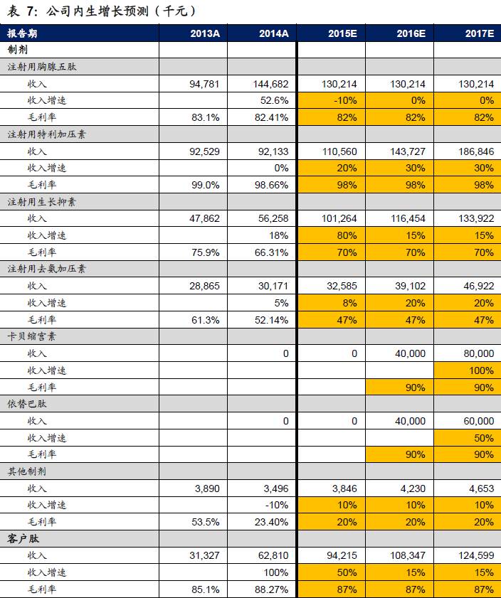 特力加压素在过去几年在重点医院销售维持稳定增长,翰宇去年更换销售总监后,特力加压素销售收到了一定的短期影响。随着该短期影响逐渐消除,公司特利加压素预计未来将维持约30%的稳定增长。