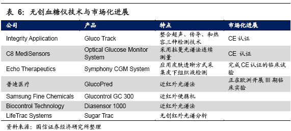 从目前无创血糖仪的市场化进展来看,Intergrity Applicaiton、C8 MediSensor、Echo Therapeutics处于相对领先的位置,但近红外光谱技术也是热点之一。若普迪医疗能够在年底拿到欧盟的CE认证,同时考虑到无创血糖检测广阔的市场潜力,则该产品潜力广阔。