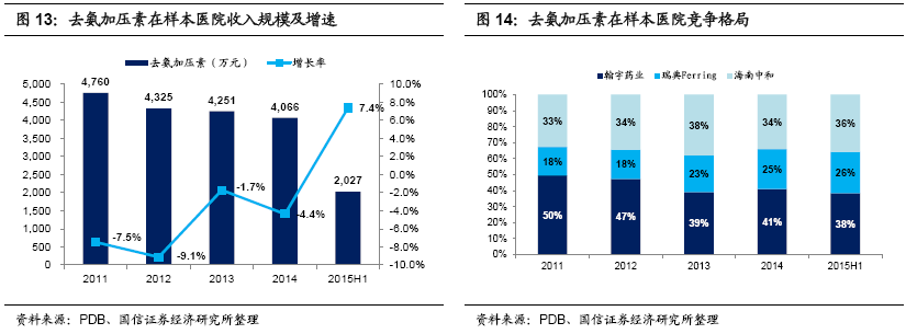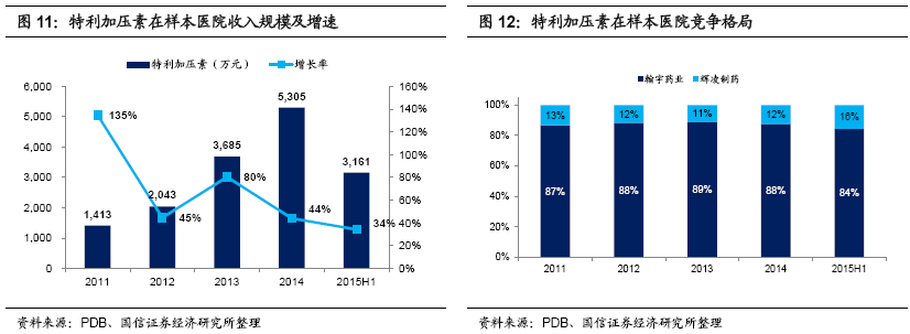 特利加压素是一种合成的血管加压素类似物,属于血管活性药物中的缩血管药物,主要用于肝硬化静脉曲张出血的止血。现临床广泛应用于肝肾综合征、肝硬化腹水、感染性休克、烧伤、急性肝功能衰竭、心脏骤停等治疗。属于非基药品种,并入选了浙江、湖北、山西、福建等10个省或自治区的乙类医保目录。公司开发的特利加压素原料药及注射剂为国内首仿药。目前国内市场仅有翰宇药业和辉凌制药销售此药,公司占据约90%的市场份额。