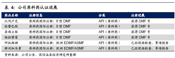 截止目前,公司美国FDA原料药认证进展顺利。重点产品如依替巴肽、格拉替雷等均获得DMF号。多肽药物的特点是均为注射剂。制剂的难点在于原料药的合成与制备,而从原料药到制剂的工艺则相对简单。公司多个原料药通过美国FDA认证标志着其多肽原料生产线及相应质量体系已达到美国FDA对GMP的要求,为后续多肽制剂ANDA顺利获批提供了有力保障。公司已经向FDA提交了依替巴肽ANDA申请,未来还将提交格拉替雷ANDA。若获批,公司计划与海外的分销商合作共同开拓制剂出口业务,这将对经营业绩提升产生重大积极影响。