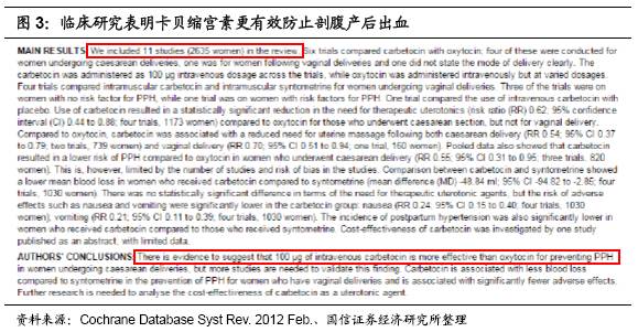 卡贝缩宫素是一种长效催产素九肽类似物。其可以与子宫平滑肌的催产素受体结合,引起子宫有节律的收缩。从而预防子宫收缩乏力导致的产后出血。与普通缩宫素每支注射后持续有效时间3-5分钟不同,卡贝缩宫素注射后每支有效时间为40分钟-1个小时,有效简化医生、护士产后的止血操作。Su LL等在2012年总结了11个关于卡贝缩宫素与缩宫素的临床比较研究(共2635名产妇参与临床),其结论为一针100ug卡贝缩宫素给药相比于普通缩宫素连续多针给药能更有效的防止女性剖腹产后出血。从临床角度,操作更简便,临床效果更好的卡贝缩宫素将逐渐替代现有的缩宫素是较为确定的趋势。