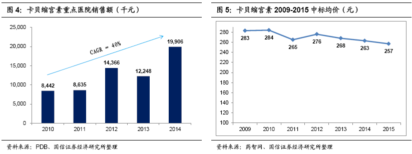 目前卡贝缩宫素国内只有辉凌制药一家厂商销售,PDB数据表明卡贝缩宫素2014年在重点医院销售为2000万元,全国销售规模预计为1亿元。过去5年复合增长为40%。从招标角度看,卡贝缩宫素2009-2015年经过多轮招标,总降价幅度仅为9%,受招标降价影响很小。而竞争品类缩宫素2015年中标价为0.26元每支,从医院用药角度,卡贝缩宫素的临床效果好,价格高,无论从药品加成,还是从取消药品加成后二次议价角度均比缩宫素具备竞争优势。