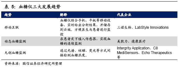 血糖仪在技术共经历了五个发展阶段。前三代基本都采用光反射法实现血糖浓度测定,第四和第五代主要依靠电化学法。目前国内主流血糖仪采用的是电化学法。第五代和第四代相比,在微量采血、多部位采血等细节方面进行了一些改进。未来,提高患者的用户体验、提高测量的精度与灵敏性以及连续测试是是血糖仪发展的方向。因此,移动互联、动态血糖监测和无创血糖监测是未来主要的三大趋势。