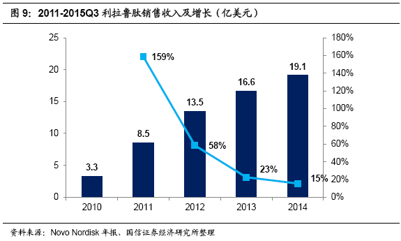 利拉鲁肽是诺和诺德开发的一种GLP-1类似物,与人GLP-1具有97%的序列同源性。它可以激活人GLP-1受体,促进胰腺细胞分泌胰岛素。与天然GLP-1不同的是,利拉鲁肽在人体中的药代动力学和药效动力学特点均适合每天一次的给药方案。而且它导致病人低血糖的概率很小,对患者具有较强的便利性和安全性。药品自上市(2009年在欧盟,2010年在美国,2011年在中国)以来即受到广泛的欢迎。