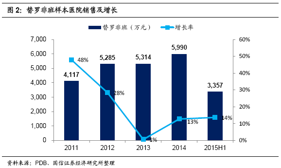从产品潜力分析,依替巴肽与替罗非班均属于血小板IIb/IIIa受体拮抗剂。样本医院数据显示,替罗非班2014年在重点医院的销售额为6000万元。过去3年的CAGR为13%。我们预计2014年替罗非班的全国销售规模约为3-5亿元。依替巴肽与替罗非班属于同一类药物且适应症完全相同,未来将在临床使用中互为补充。随着我国老龄化程度不断加深,急性冠状动脉综合症发病率有望逐年提升,血小板IIb/IIIa受体拮抗剂的成熟时的市场规模约在8-10亿元。其中依替巴肽的潜在市场规模为3-5亿元。