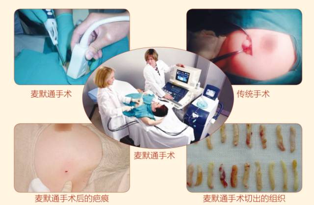 相对于传统手术3-5厘米的切口,麦默通手术切口只有2-5毫米,无须缝合、不留疤痕;而且同一侧多个病灶,可以通过一个切口切除(3个以下,距离不超过10厘米)。避免了切开皮肤、皮下组织和正常腺体,组织损伤小,恢复快,对于乳腺深部肿物和肥胖患者,优势尤为明显。