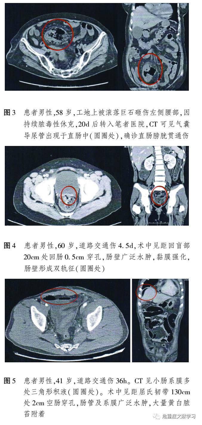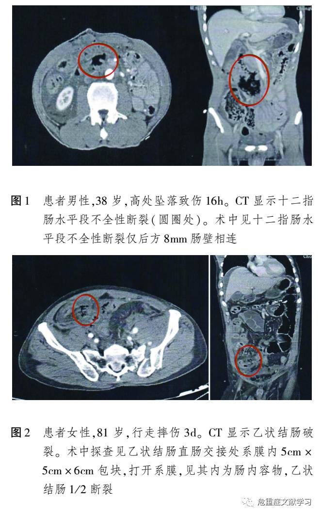严重钝性伤且血流动力学稳定者,可以也应该行从头至大腿中段的增强 CT 检查,并获得动脉相、静脉相和延迟相图像,以明确实质性和空腔脏器的损伤和严重程度,明确是否有造影剂外渗等血管损伤征象等。CT 诊断小肠损伤总敏感性和特异性为88.3%和99.4% ,对于高度怀疑的患者,多重造影 CT 扫描(静脉注射、口服、直肠或膀胱内灌注)可提高肠道损伤诊断率,肠道损伤影像包括直接和间接征象。 提示肠道损伤的 CT 直接征象是肠壁连续性中断和肠壁内血肿,需要多切面、连续观察,可见到气体或其他肠内容物经肠壁中断处移至肠腔外(图1、2)
