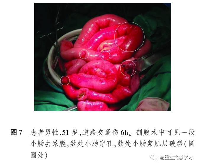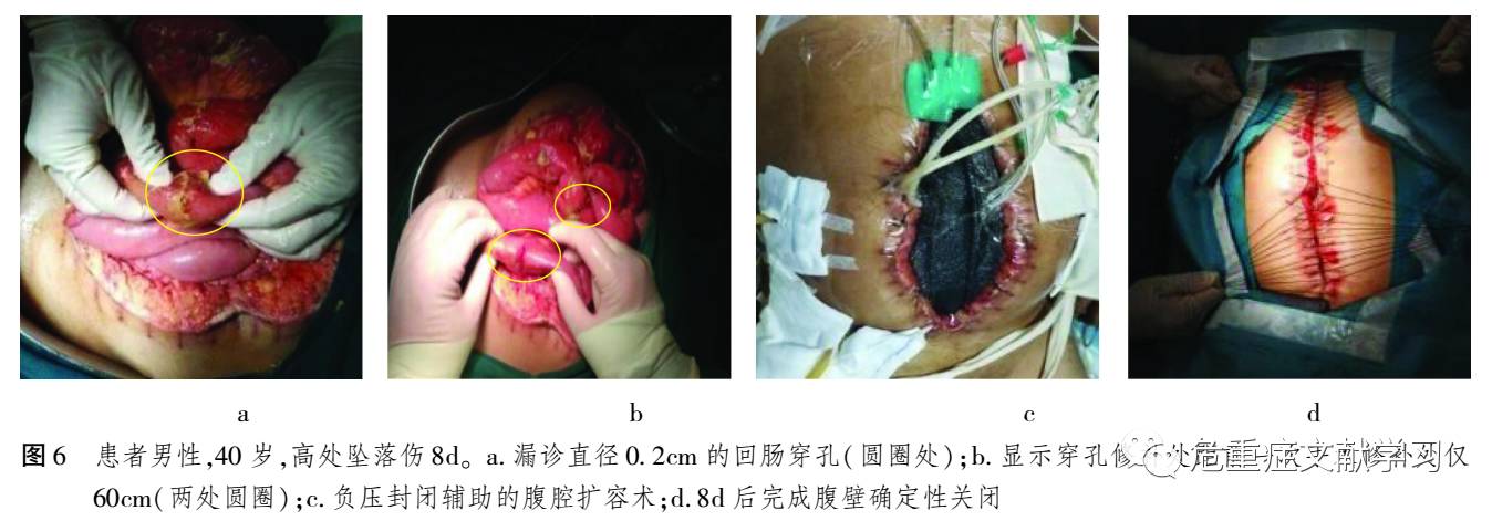 苔附着,探查不应满足于发现一处肠道损伤。 笔者近期收治了1 例伤后 3d 剖腹修补回肠穿孔,5d 后转入再次探查发现距离修补处 60cm 近侧回肠有 0.2m穿孔的漏诊病例,导致严重腹腔感染,需行采用负压封闭辅助的腹腔扩容术(图6)。 对于穿透伤的肠壁血肿应切开探查,尤其是系膜缘血肿。