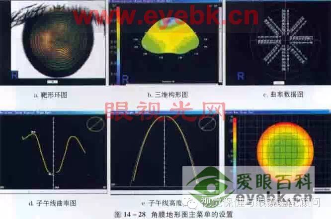 ③角膜散光两极不对称,呈葫芦状(图14-29-e),提示角膜不对称性散光。