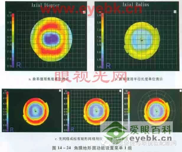 ①角膜纵向的黄色"领结"状图形,提示角膜顺律散光,黄色的垂直子午向角膜较弯,蓝色的水平向角膜较平,近视散光轴位近180°,黄色区域颜色越深散光焦度越高(图14-29-a);角膜横向的黄色"领结"状图形,提示角膜逆律散光,较为少见(图14-29-b)。