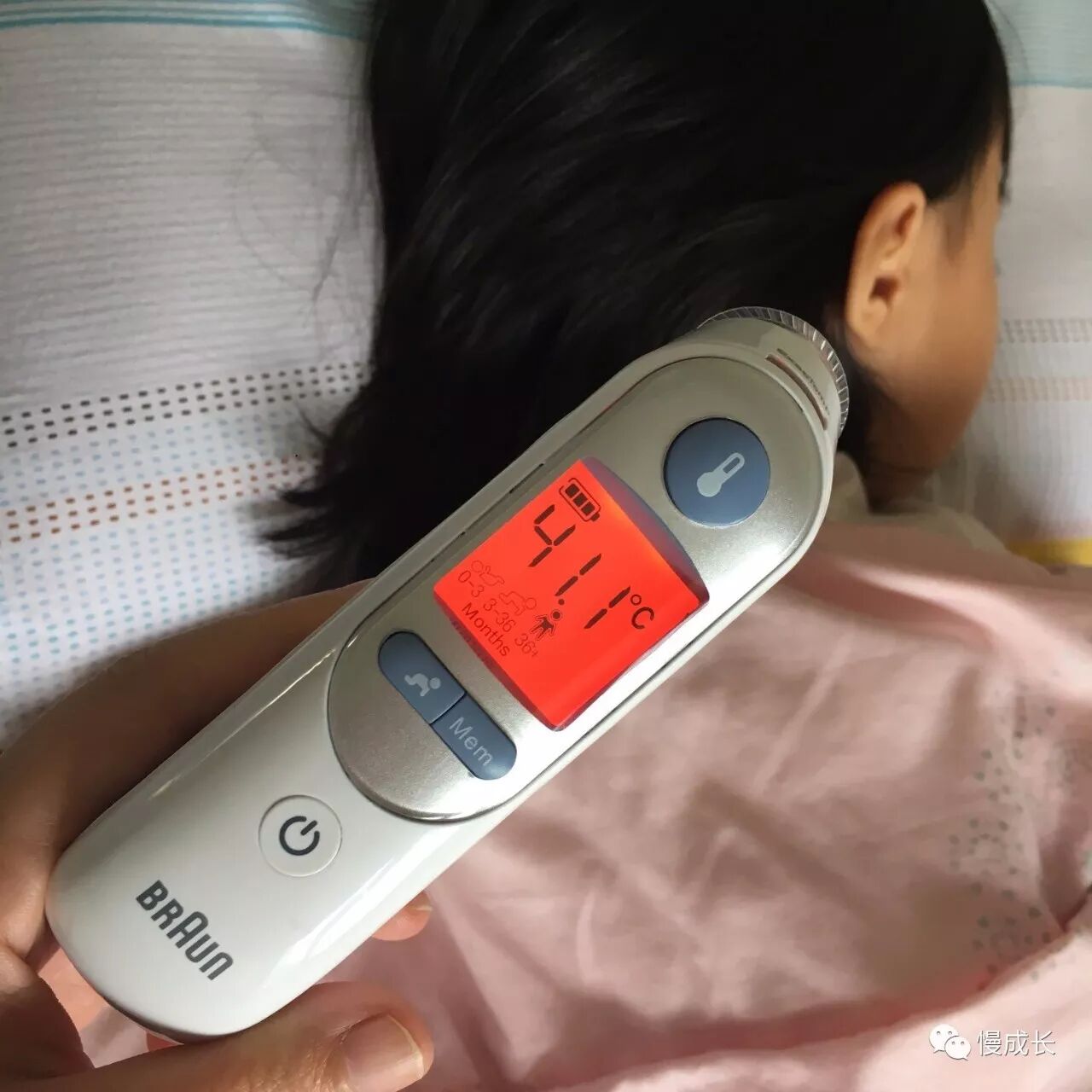 刚巧那几天我家原来的耳温枪摔坏了,让老公紧急买了个,几个小时就快递到家,结果这个耳温枪准确性差了点,总之一上来就是红红的40多度,最高时到了41.7……