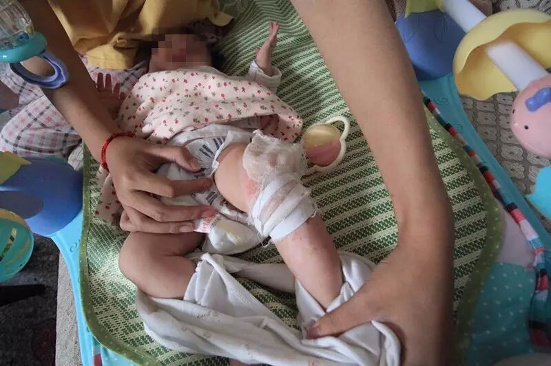 昨日上午,在铜山区柳泉镇单庄村周女士的家里,已3个月大的欣欣乖巧地躺在床上,每隔几分钟就要抬起右脚去触碰左腿被烫伤的部位。周女士解开欣欣的左裤管,其左膝盖及以上被烫伤的部位,大部分已愈合并长出了粉红色的新皮。