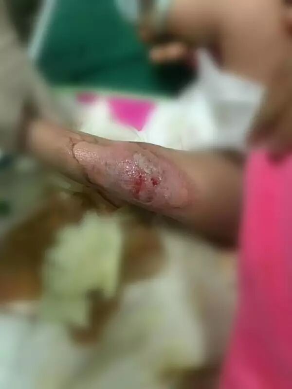 经过一段时间的治疗,欣欣被烫伤的皮肤愈合并长出了新皮。9月初,欣欣出院回家修养。“孩子这段时间主要是皮痒,她又不能说话,只能乱动挠挠。”