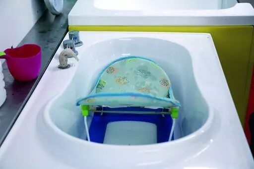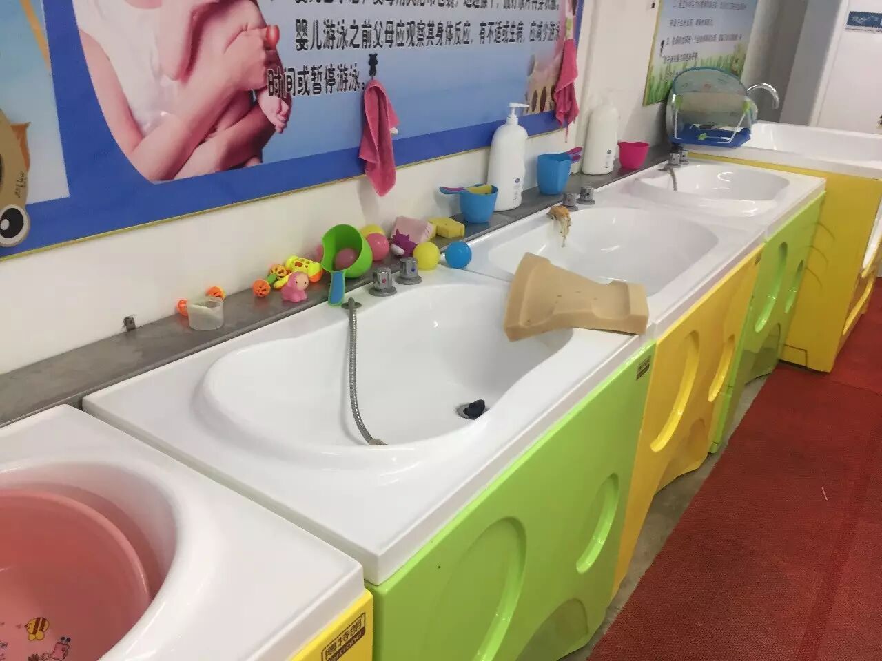 员工张女士带记者来到洗澡间,记者看到,1米多高的台子上有多个澡盆,每个澡盆边有冷热阀门。张女士指着其中一个澡盆说,当时是她和店老板将欣欣从澡桶里抱出来,送到这个洗澡盆的。“把欣欣送到洗澡盆放在支架上,欣欣脖子上戴的游泳圈碰到了热水阀门,阀门流出热水浇到欣欣左腿上。”