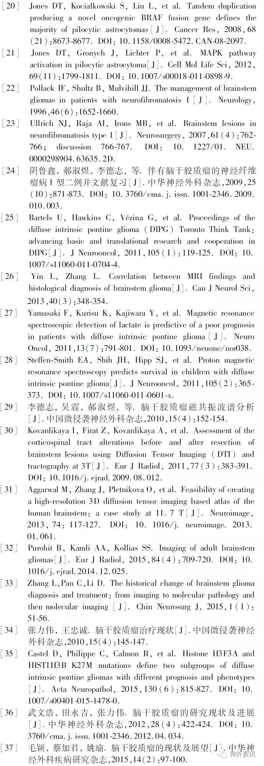 BSG的治疗以综合治疗为主,包括手术、放疗、化疗、基因靶向治疗以及免疫治疗等新疗法。放疗是DIPGs的标准治疗方案,但只能短暂的改善症状,无法延长其总生存期。化疗对部分复发或术后残余的PAs有效,但各种化疗方案均未能显著改善DIPGs的预后[19,36-38]。手术可显著改善外生型及局灶型低级别肿瘤的预后[39-40]。