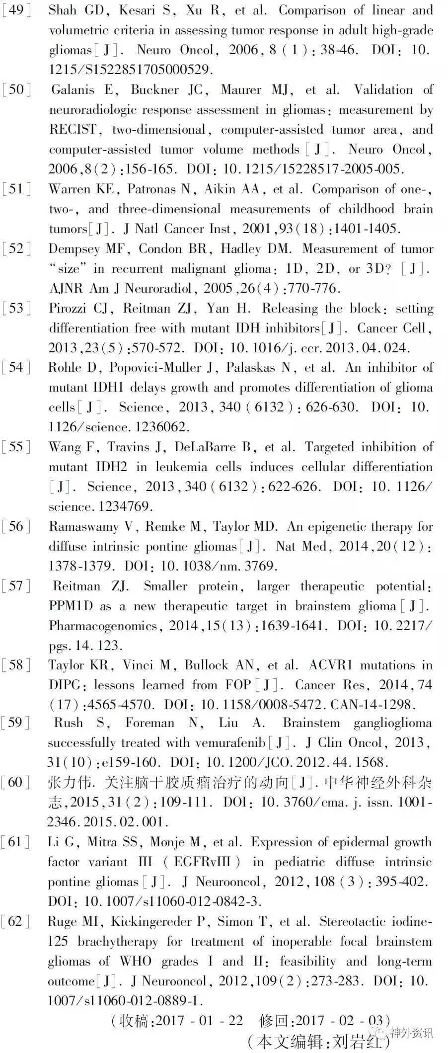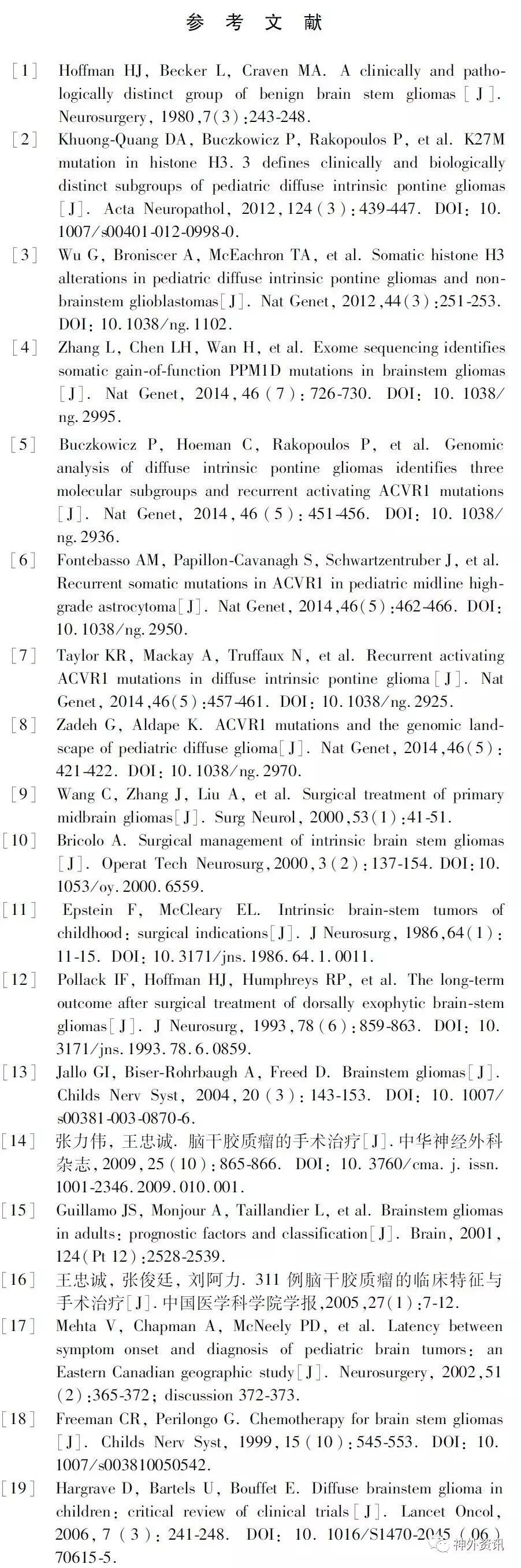 今天刊登的是中华医学会神经外科学分会肿瘤学组和脑干胶质瘤综合诊疗中国专家共识编写委员会在《中华神经外科杂志》2017年第三期上发表的《脑干胶质瘤综合诊疗中国专家共识》,欢迎阅读。