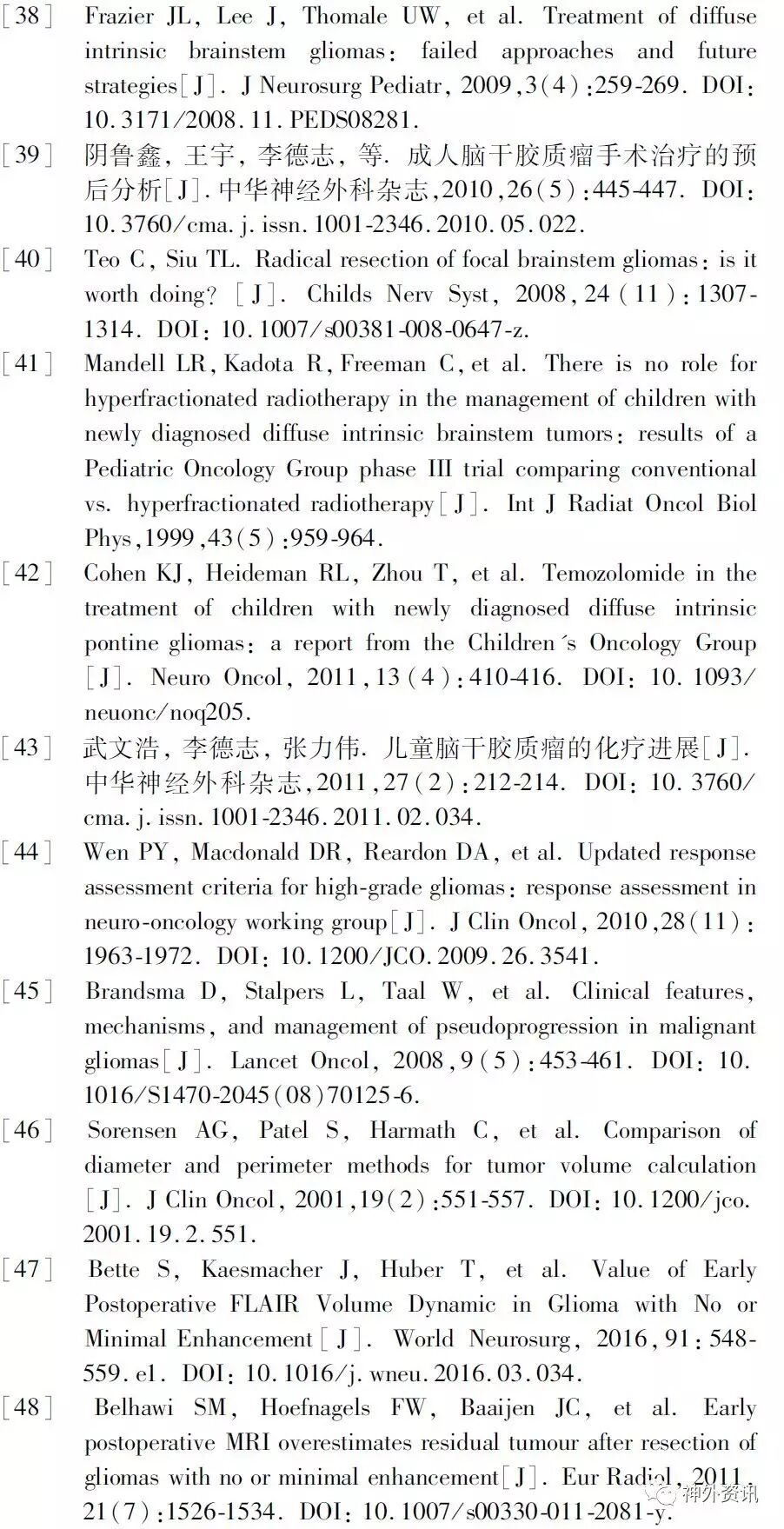 3. 放疗方案:放疗无法延长多数患者的总生存期,只能在短时间内缓解症状,症状缓解期因病理级别而异。(1)靶区的制定:强烈推荐具备条件的单位采用CT和(或)MRI模拟定位,并行CT/MR/PET-CT图像融合,以便准确地勾画靶区,确定靶区时应参照术前、术后和最近的MRI资料及PET-CT结果。(2)治疗计划:以95%的靶体积定义处方剂量,依据照射体积大小的不同,推荐使用54~60 Gy的剂量并分割为每次1.8~2 Gy。多数研究表明,常规放疗总剂量>60 Gy并未使临床获益[41]。推荐采用三维适形放疗或调强放疗技术。精确放疗可较好地保护正常脑组织,减少放射性损伤。①高级别BSG:放疗应在诊断明确后尽快开始,常规分割剂量为1.8~2.0 Gy/次,5次/周,标准剂量为54~60 Gy/30~33次。推荐肿瘤局部照射,临床靶体积(clinical target volume,CTV)为实体瘤体积(gross target volume,GTV)即 FLAIR/T2WI上的异常区域,加外放1.5~2.0 cm。CTV外放0.3~0.5 cm的边界为计划靶体积(planning organ riskvolume,PTV);②低级别BSG:根据术前和术后MRI确定肿瘤体积,通常采用FLAIR像或T2WI上异常信号为GTV,CTV为GTV外放1~2 cm间距,低级别胶质瘤接受总剂量为45~54 Gy/25~30次,1.8 Gy/次。(3)放疗反应:放疗的不良反应依据发生的时间和临床表现划分为3种不同类型:急性(放疗后6周内发生)、亚急性(放疗后6周至6个月发生)和晚期(放疗后数月至数年)。急性和亚急性放射性损伤可能为血管扩张、血脑屏障受损和水肿所致。脑干放疗的急性反应表现为既往神经功能障碍症状加重或出现新的脑神经功能障碍;MRI表现为脑干变粗、弥漫性水肿,应用糖皮质激素可缓解症状。延髓肿瘤放疗后如出现呼吸、心跳频率和节律的变化,则放疗死亡风险显著增加。放疗期间或之后难以控制的脑干水肿可用靶向抗血管生成药物治疗减轻症状。假性进展(pseudoprogression)多发生于替莫唑胺同步放化疗后2~3个月内,属于亚急性放射反应,病理改变是早期放射性坏死,多数可自愈。晚期放射反应常常是进行性和不可逆的放射性坏死,表现为神经功能障碍的持续恶化,应尽可能避免。
