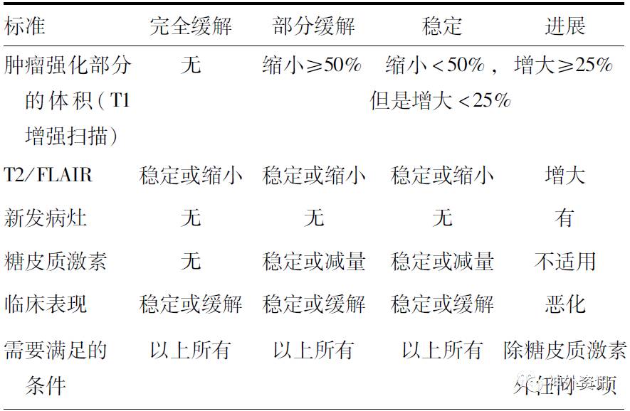 推荐采用2010版神经肿瘤评价标准(response assessment in neuro-oncology,RANO)评估肿瘤对放化疗的反应(表3)。