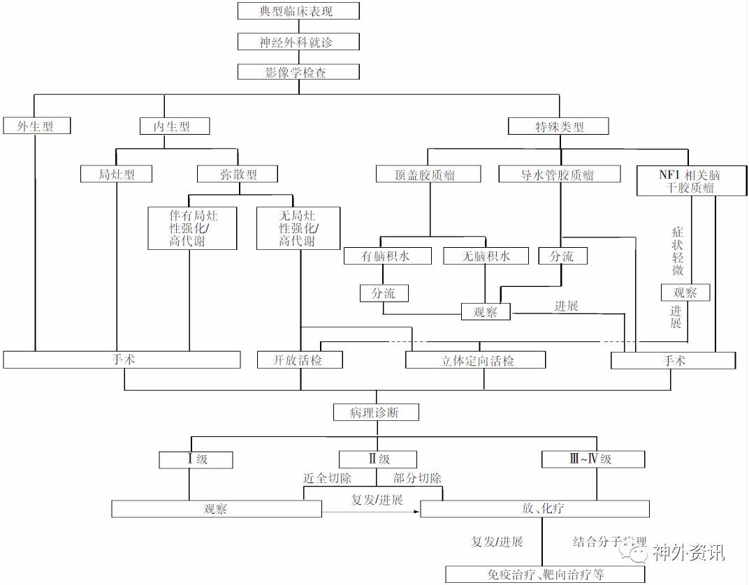 图5. 脑干胶质瘤的诊疗流程图。(注:手术前应常规行DTI检查,明确肿瘤和纤维束的位置关系)(NF1为I型神经纤维瘤病)
