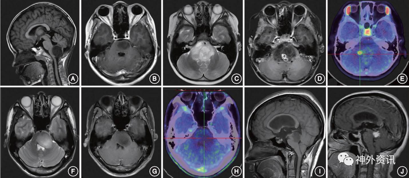 图1. 基于MRI的脑干胶质瘤分型 A.外生型;B.局灶内生型;C-E.弥散内生型脑干胶质瘤伴有局灶强化和高代谢;F-H.弥散内生型脑干胶质瘤无局灶强化和高代谢(C、H为11C-MET PET-CT影像);I.顶盖胶质瘤;J.导水管胶质瘤。