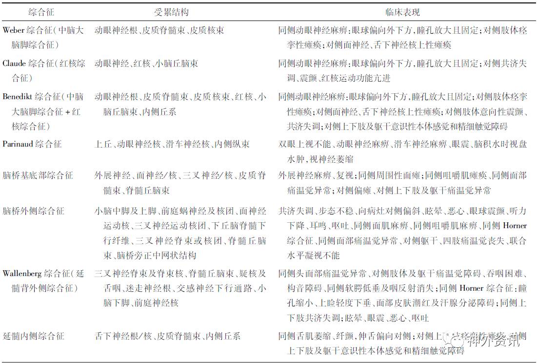 BSG的常见临床表现包括:脑神经功能障碍、长束征和共济失调。脑神经功能障碍是脑神经纤维或核团损伤所导致,可反映肿瘤的部位和累及范围,具有定位诊断价值。长束征是指脑干内长的纵行纤维束受累所表现出的临床征象,主要包括皮质脊髓束损伤导致的对侧肢体痉挛性瘫痪、肌张力增高、腱反射亢进、病理征阳性;脊髓丘脑束损伤导致的对侧肢体粗略触压觉和痛温觉异常;内侧丘系损伤导致的对侧肢体意识性本体感觉和精细触觉异常。共济失调主要为小脑脚损伤所致,内侧丘系损伤可导致感觉性共济失调。BSG常见的临床综合征见表1。肿瘤阻塞脑脊液循环通路后可形成幕上脑积水,出现头痛、呕吐、视盘水肿或视神经萎缩等颅内压增高的表现。