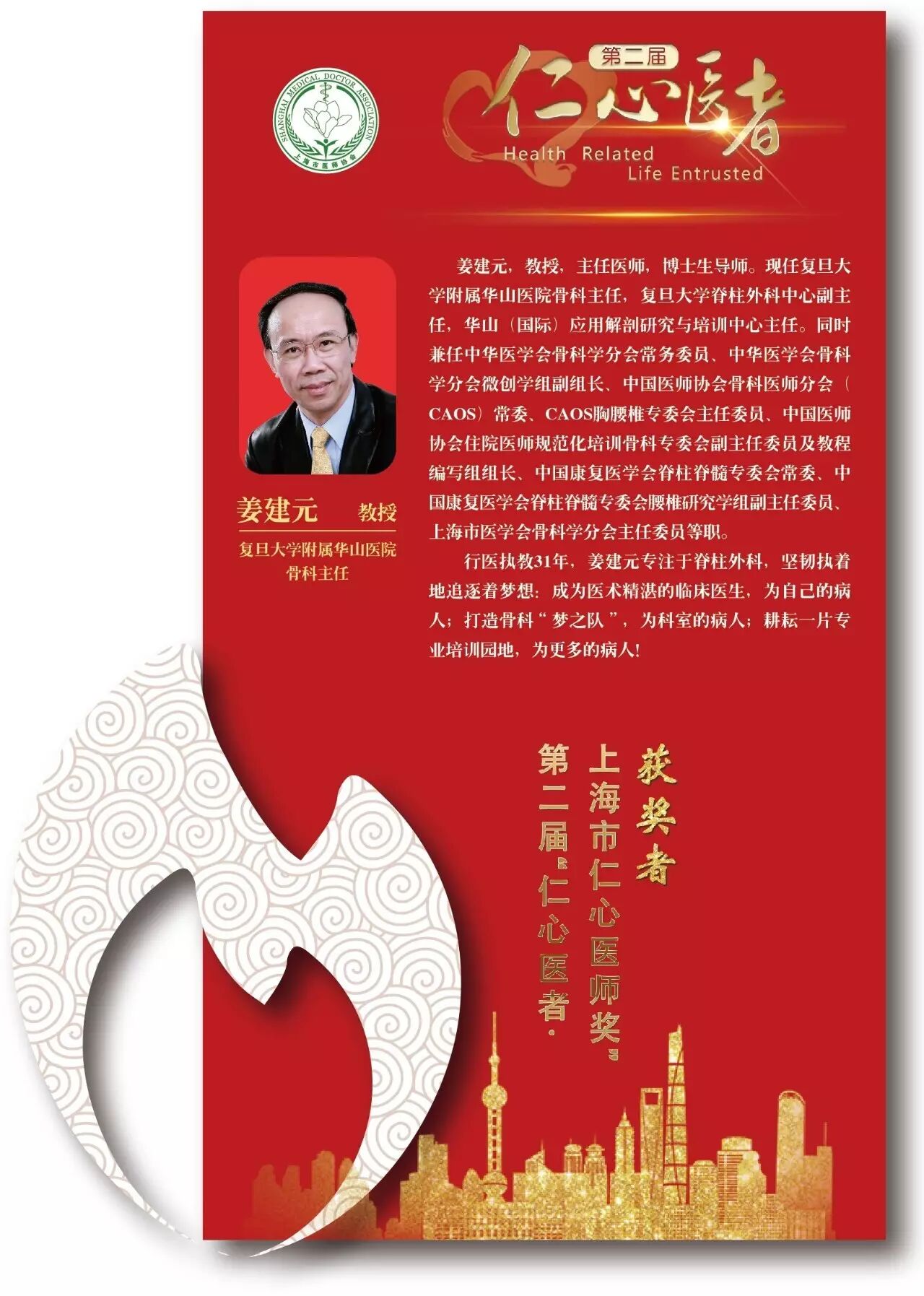 7月12日下午,第二届“仁心医者·上海市仁心医师奖”颁奖典礼在上海科学会堂隆重举行,华山医院骨科主任姜建元教授荣获第二届“仁心医者·上海市仁心医师奖”,受到隆重表彰。此次评选活动经过推荐申报、初评、终评几个阶段的角逐,最终,共有10位医生荣获上海市仁心医师奖、10位医生荣获上海市仁心医师奖提名奖。