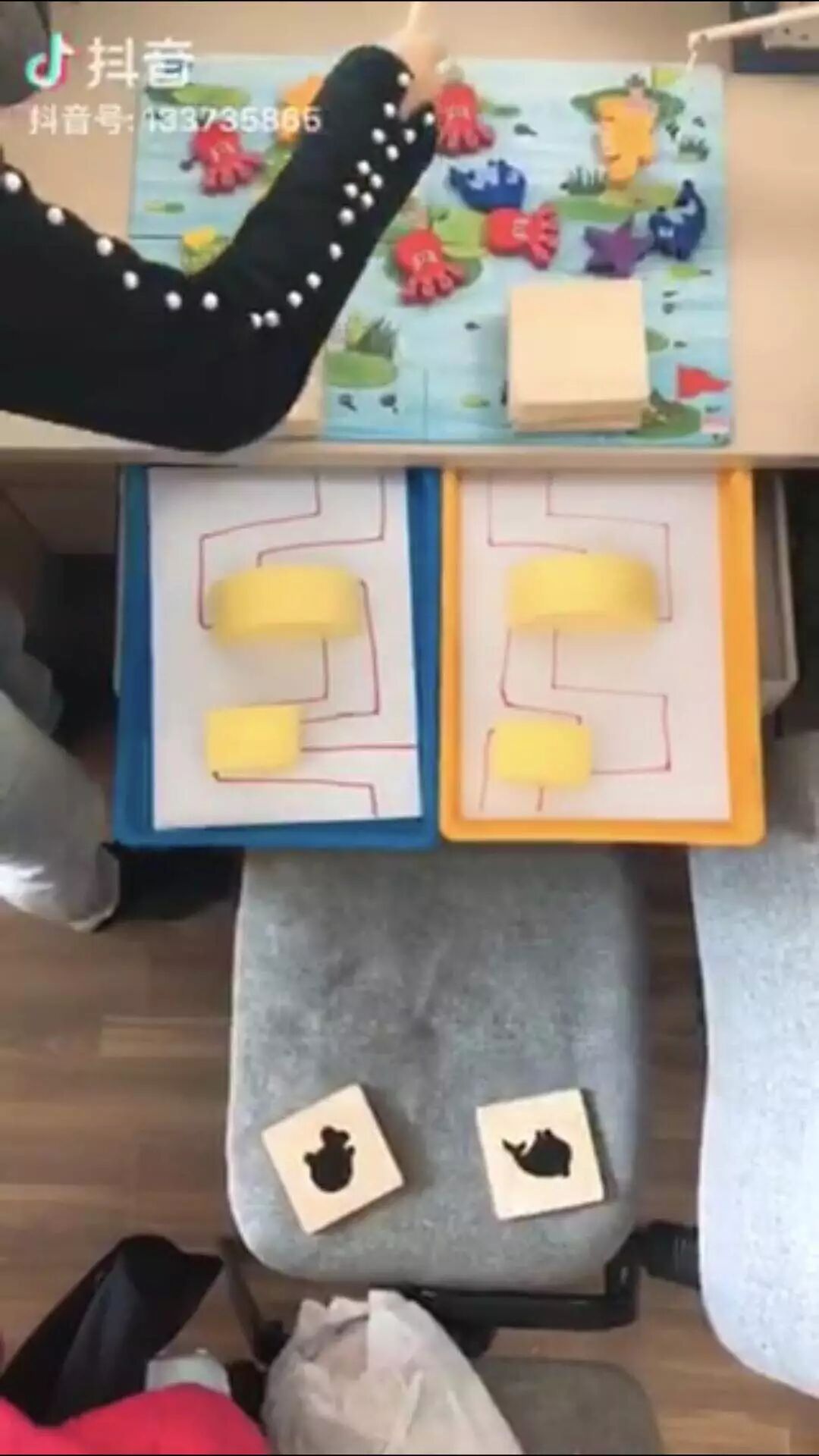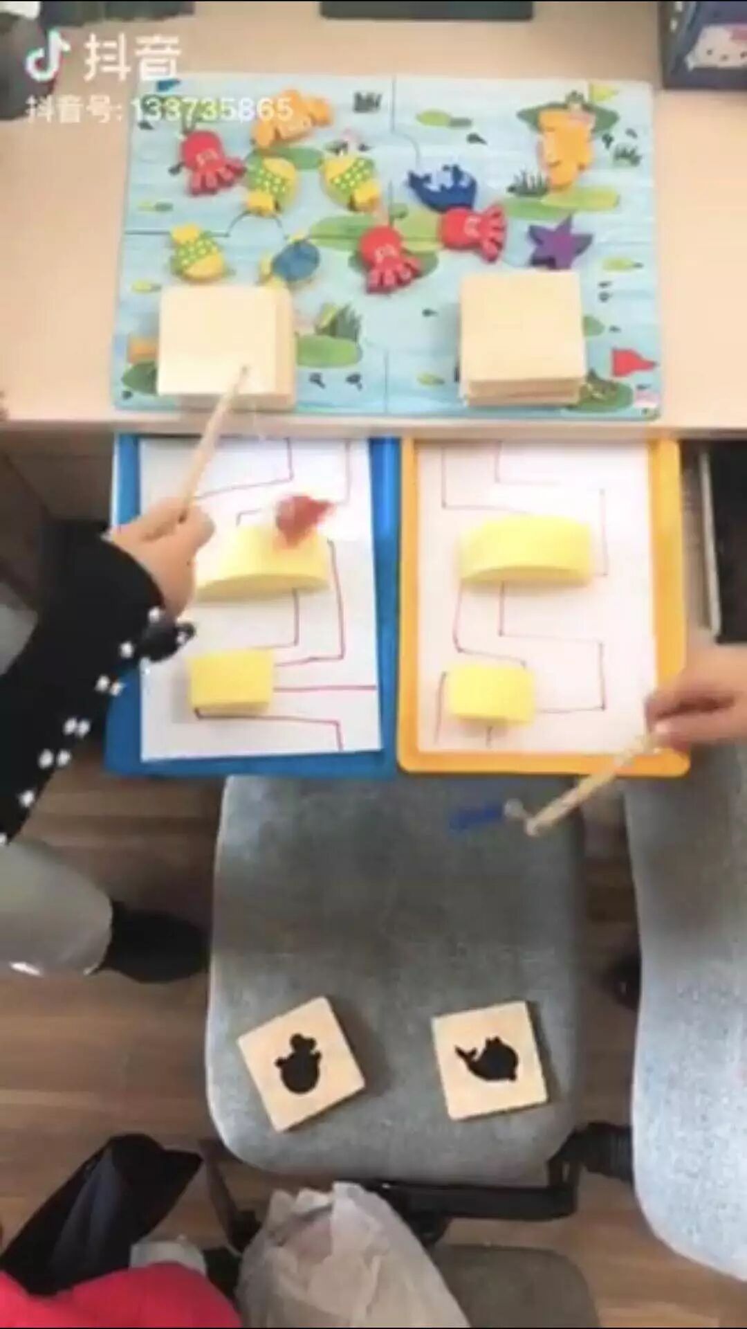 幼儿两人一组,每人翻开一张底板,看看上面画的是什么小动物,然后在桌上找到对应的小动物,用钓竿钓起小动物,接着一边钓着小动物,一边让小动物沿着老师事先画好的迷宫线路走到终点,率先到达目的地的幼儿获胜。
